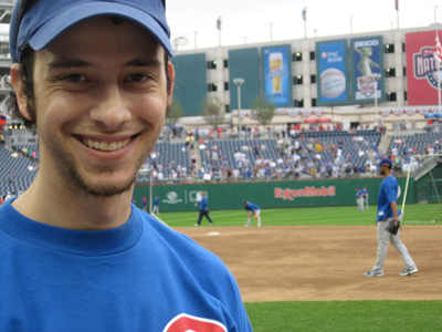 On Friday I left my house around 4pm to head out to Fin MacCool's for the Cubs pre-game bar party (barty). Despite being entrenched in the ghetto, Barracks's Row was pretty nice and the bar itself was safe and filled with 9-5'ers and a few coupled-off Cubs fans. I found a corner spot in the bar and I talked with the guy next to me for an hour about our iPhone case being the same; riveting, I know. I finally walked myself through Ghetto Lite to the stadium where I struck up a conversation with a Mennonite pastor (wear Cubbie blue of course) and offered Jamie's unused ticket to the game. With my six-hour friend in tow, we headed up approximately thirty miles of spiraling concrete to our seats. Everyone was glowing about how nice Nationals Stadium was but I was wholly underwhelmed. It's no Wrigley--it's not even a Miller Park. I'm sure the view is great if you're one of maybe 1,000 seats but if you're anywhere else your views are pretty lousy. Anyway, we met up with two of Jamie's school friends, Meghan and Sam, and naturally they were rooting for the Cubs. They were both pretty cool and although I felt really old when I knew who Jody Davis was, it was fun just hanging out with the three of them and talking baseball for a few hours. Meghan was kind enough to take this first picture--of me and Marmol. I of course had my custom Marmol t-shirt-jersey on and received a lot of "cool"'s and a few "dork"'s with it. After the Cubs had been thoroughly beaten, we blobbed our way to the Subway with 40,000 other people and metro'd home. Unfortunately, I have to take a bus from the metro to my house and (unbeknownst to me) the buses had already stopped running for the evening. After 20 minutes or so I struck up a conversation with a grad student at AU and we decided that since we only lived a few blocks away from each other we'd just walk. It took a while to get back but we made it safely back to her place across from the National Cathedral and I kept going to see poor Chomp, who had been her crate for a good eight hours.